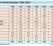 Ebenfalls Federn lassen muss nach den Ergebnissen der Marktforscher PVC. Wurde für 1999 noch ein Marktanteil von 38 Mio. m² errechnet, wird bis ins Jahr 2002 ein Rückgang auf 32 Mio. m² erwartet.
