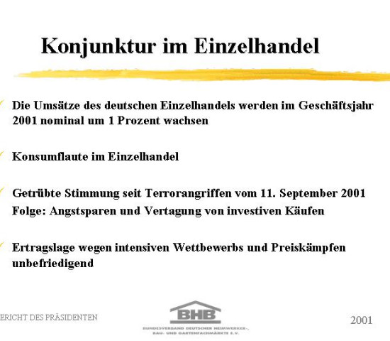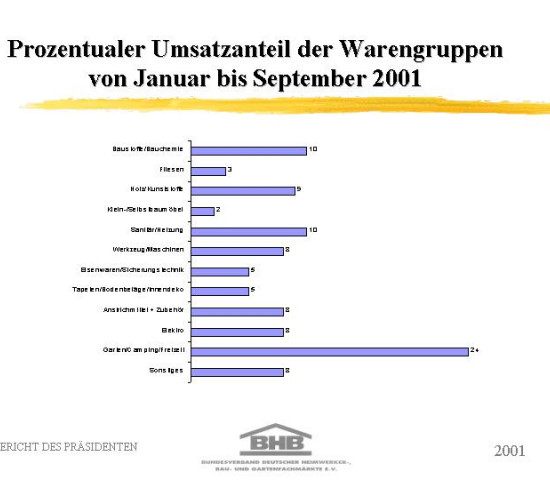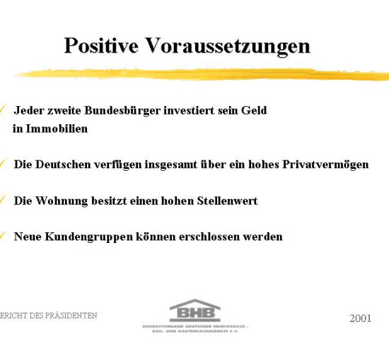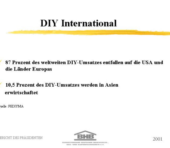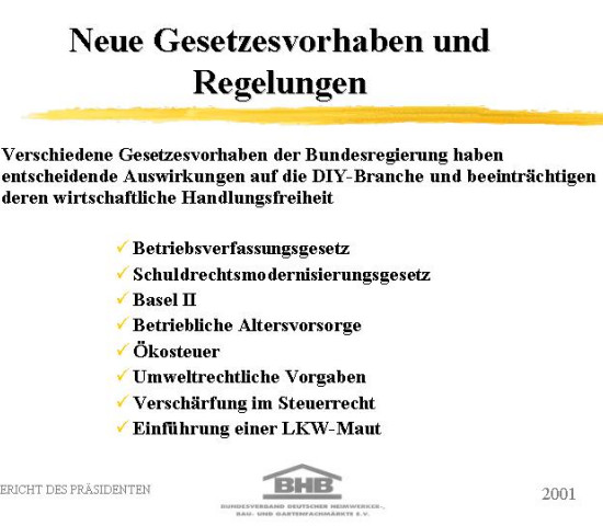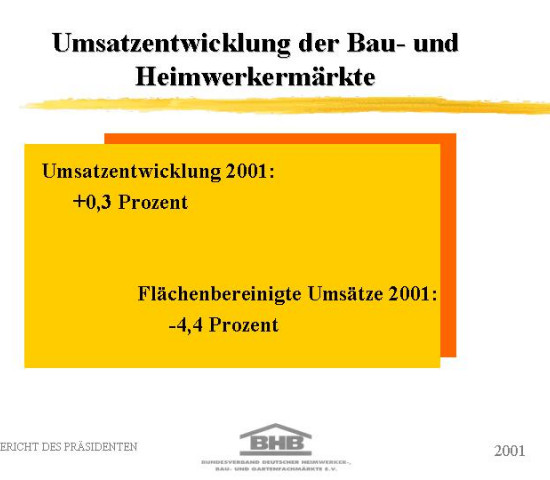 Schon in seinem einleitenden Beitrag im diy spezial, dem Supplement des diy Branchenmagazins zum BHB-Symposium vom 20. und 21. November 2001 in Köln, hat der Verbandsvorsitzende die Tonlage angegeben: „Mut in schwierigen Zeiten“ überschrieb er seinen Kommentar und forderte mehr Selbstbewusstsein der Branche. Wo die Branche steht, welche Antworten sie mit ihrem Verband in der öffentlichen Diskussion in Zeiten des Konsumrückgangs gibt, führte der OBI-Aufsichtsratschef in seinem Statement aus. Und was die Branche ihrem Kunden vermitteln sollte: „Investieren in Wohnen schafft Werte.“ Wir dokumentieren hier die Unterlagen zum Vortrag von Manfred Maus.