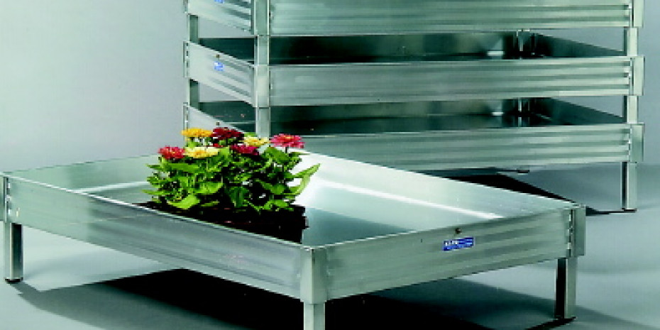 Von Kano, Riedstadt, werden nun Aluminium-Wannen auf stabilen Ecksäulen angeboten. Sie sind, eigenen Angaben zufolge, platzsparend stapelbar und können mit einem Hubwagen leicht transportiert und verschoben werden. Der Wannenrand ist 70 mm hoch, als Standard-Größe wurde das Europaletten-Maß gewählt. Eine Säulenhöhe von 160 mm habe sich zwar bisher bewährt, so das Unternehmen, allerdings seien auch andere Höhen kein Problem. Des weiteren verfügen die Wannen über einen integrierten Wasserablauf.