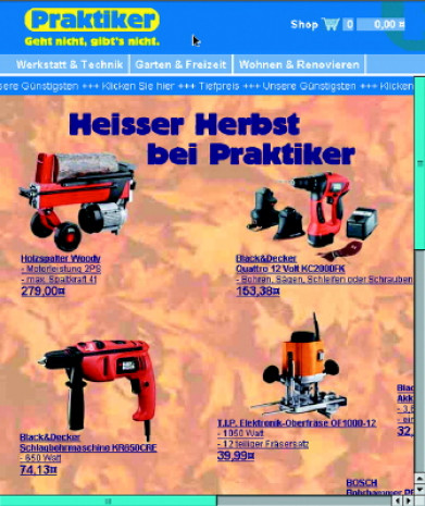 Damit, so Praktiker, bleibe man seiner bisherigen Internetstrategie treu und biete dem User neben einer kundenfreundlichen Oberfläche einen direkten Zugang zum Online-Shop. Dieser konnte seinen Umsatz im Vergleich zum Vorjahr um rund 450 Prozent steigern. Im Shop-Bereich findet der ambitionierte E-Heimwerker jetzt zahlreiche Produkte aus den Bereichen Werkstatt und Technik, Garten und Freizeit sowie Wohnen und Renovieren. Der Shopbereich wurde um rund 500 Artikel zu Werkstatt und Technik ergänzt. Ausführliche Tipps und Anleitungen ergänzen das umfangreiche Shop-Angebot. Zudem haben User erstmals die Möglichkeit, Zubehörartikel zu bestellen.