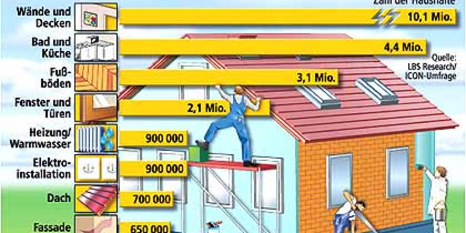 Besonders emsig sind die Deutschen der Umfrage zufolge beim Verschönern ihrer Wohnräume: Gut 14 Millionen Haushalte haben in den letzten drei Jahren Wände und Decken ausgebessert, tapeziert oder gestrichen. Annähernd neun Millionen Haushalte sahen für Bad und Küche die Zeit gekommen. Fußböden sowie „Türen, Fenster und Jalousien“ wurden in jeweils sieben Millionen Haushalten aufpoliert oder durch neue ersetzt. Rund 4,8 Millionen Immobilien haben laut Umfrage zwischen 1999 und 2001 eine Modernisierung der Heizungs- bzw. Warmwasseranlage erfahren. Bei 3,7 Millionen Objekten wurden Arbeiten an der Elektroinstallation durchgeführt.--nextpage--