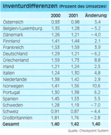 Die Höhe der Inventurdifferenzen ist aber natürlich auch abhängig vom Geschäftstyp sowie dem Produktsortiment. Die höchsten Verluste haben die Marktforscher in Kaufhäusern und Geschäften mit einem gemischten Warensortiment zu verzeichnen sowie in anderen Non-Food-Geschäften wie Spielwarenläden und Apotheken. Die Bereiche Kleidung und Textilien sowie Haushaltwaren weisen ebenfalls sehr hohe Raten auf. Die geringsten Inventurdifferenzen wurden in Fachgeschäften festgestellt. In Bau- und Heimwerkermärkten (inkl. Möbel) sanken die Inventurdifferenzen 2001 im Vergleich zum Vorjahr von 1,72 auf 1,68 Prozent.