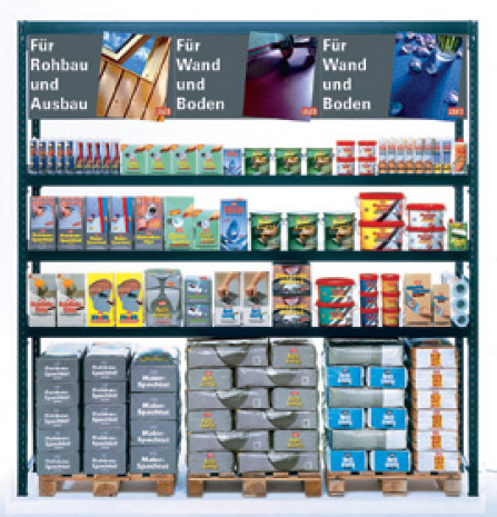 Die Schwerlastregale beinhalten drei Module. Jedes Modul steht für ein bautechnisches Thema. Für jedes Modul gibt es ein Regalschild. Sie stellen mit ihrer verbalen und visuellen Aussage zusätzliche Orientierungshilfen für die Kunden dar. Auch diese Regalschilder haben, wie die Bilder auf den Packungen der einzelnen Themenbereiche, Ambiente-Charakter. Das Ambientebild des fertigen Dachausbaus beispielsweise, weist auf das Thema „Rohbau und Ausbau“ hin. „Der Kunde kann damit erstmals alle Produkte, die er für ein Bau- und Renovierungsvorhaben benötigt, auf einen Blick erfassen“, ist sich Dr. Büchtemann sicher…