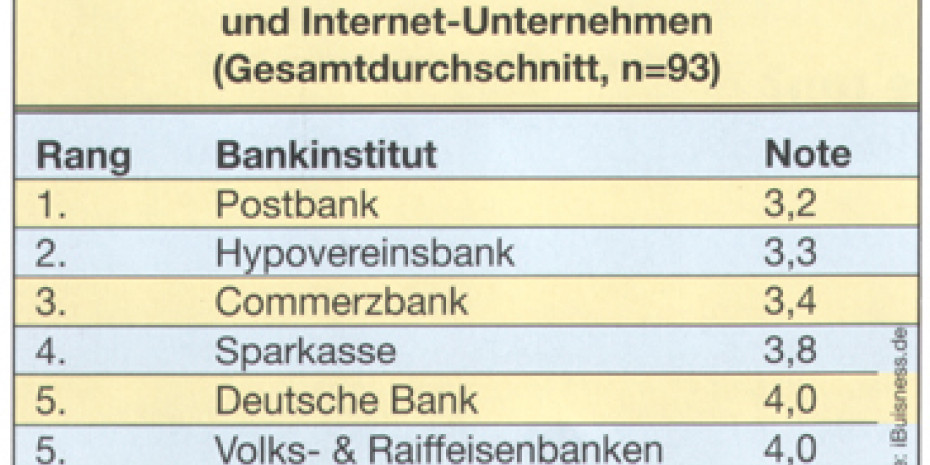 Insgesamt gesehen, so analysiert der Trendletter ‘iBusiness Executive Summary’ in seiner aktuellen Ausgabe, schnitten die Banken so schlecht ab, weil sie sich bisher nicht genug beziehungsweise gar nicht auf die Bedürfnisse der Internet- und Multimedia-Branche eingestellt haben. Eine an der Umfrage teilnehmende Unternehmensberatung klagt, dass das Verhalten ihrer Bank ein Grund für die Anmeldung der Insolvenz war. Ein Multimedia-Dienstleister ist sogar der Meinung: „Banken töten den Mittelstand – ohne Wenn und Aber!“