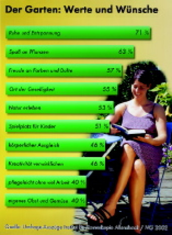 Einer Umfrage des Instituts für Demoskopie, Allensbach, zufolge, finden 71 Prozent der Gartenbesitzer Ruhe und Entspannung in ihrem Garten. Spaß an Pflanzen haben 63 Prozent und die Vielfalt der Farben und Düfte genießen 57 Prozent. Knapp die Hälfte aller Gartenbesitzer können sich, so die Ergebnisse der Umfrage weiter, nicht vorstellen, auf den garten verzichten zu müssen. Für sie sei der Garten ein Stück Lebensqualität und unmittelbarer Ausdruck von Lebensfreude. Legte noch vor zehn Jahren nur jeder vierte Gartenbesitzer besonderen Wert auf einen pflegeleichten Garten, sind es heute schon 40 Prozent. Einer Mitteilung der Industrievereinigung Gartenbedarf e.V. (IVG) zufolge, sei dies die Folge gesellschaftlicher Veränderungen – wie zum Beispiel die Zunahme der Single-Haushalte und der Tatsache, dass in immer mehr Familien sowohl Mann wie auch Frau berufstätig sind.