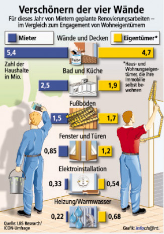 Die Erneuerung von Bädern und Küchen steht bei Mietern (13 Prozent oder 2,54 Millionen) sogar häufiger auf der Tagesordnung als bei Eigentümern (zwölf Prozent oder 1,86 Millionen). Etwa gleichauf ist der Einsatz beider Gruppen, wenn es um eher kleinere Renovierungsarbeiten geht. So haben zum Beispiel 28 Prozent aller Mieter (das sind 5,39 Millionen) und 31 Prozent aller Eigentümer (4,71 Millionen) vor, im laufenden Jahr Wände und Decken auszubessern, zu tapezieren oder zu streichen. Beim „Aufmöbeln“ von Fußböden erweisen sich Eigentümerhaushalte mit einem Anteil von elf Prozent (1,68 Millionen) deutlich aktiver. Aber immerhin wollen sich auf diesem Feld noch 1,46 Millionen Mieterhaushalte (acht Prozent) betätigen.