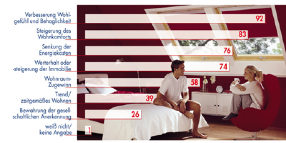 Auch der Gedanke an Wohnraum-Zugewinn motiviert die Bundesbürger zu modernisieren – mehr als jeder zweite nannte dieses Ziel. Deutlich weiter hinten rangiert der Wunsch nach zeitgemäßem, trendbetontem Wohnen, den 39 Prozent der Befragten äußerten. Hier scheinen sich die Deutschen vor allem auf den eigenen Geschmack und ihr eigenes Empfinden von Behaglichkeit zu stützen.
