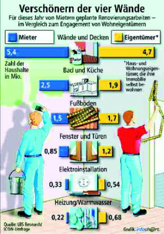 Die Erneuerung von Bädern und Küchen steht bei Mietern (13 Prozent oder 2,54 Millionen) sogar häufiger auf der Tagesordnung als bei Eigentümern (zwölf Prozent oder 1,86 Millionen). Etwa gleichauf ist der Einsatz beider Gruppen, wenn es um eher kleinere Renovierungsarbeiten geht. So haben zum Beispiel 28 Prozent aller Mieter (das sind 5,39 Millionen) und 31 Prozent aller Eigentümer (4,71 Millionen) vor, im laufenden Jahr Wände und Decken auszubessern, zu tapezieren oder zu streichen.