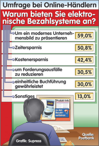 Dass noch nicht einmal die Hälfte (42,4 Prozent) der Online-Händler die Kostenersparnis als Vorteil von Bezahlsystemen nennt, so die Untersuchung, liegt vor allem an einer mangelnden Transparenz. Denn nur 50 Prozent der befragten Unternehmen bejahen, dass sie die Kosten eines jeden einzelnen Auftragvorgangs erfassen. Die Kostenermittlung ist aber eine der wesentlichen Voraussetzungen für die Beurteilung der Wirtschaftlichkeit eines Bezahlsystems.