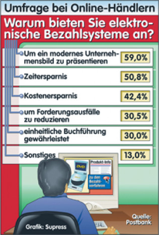 Zu den wichtigsten Ergebnissen der Untersuchung gehört die Erkenntnis, dass die Mehrheit der Online-Händler ein erhebliches Informationsdefizit bezüglich der Möglichkeiten und Vorzüge beim Einsatz von Bezahlsystemen im Internet haben. Weiteres Resultat: Die insgesamt 203 befragten Unternehmen, die elektronische Bezahlsysteme einsetzen, versprechen sich davon in erster Linie einen positiven Einfluss auf das eigene Image (s. Grafik). Erst dann kommen rein betriebswirtschaftliche Gründe wie Zeit- und Kostenersparnis. Dahinter folgen die Minimierung von Forderungsausfällen sowie die einheitliche Buchführung. Dass noch nicht einmal die Hälfte (42,4 Prozent) der Online-Händler die Kostenersparnis als Vorteil von Bezahlsystemen nennt, so die Untersuchung, liegt vor allem an der mangelnden Transparenz. Denn nur 50 Prozent der befragten Unternehmen bejahen, dass sie die Kosten eines jeden einzelnen Auftragvorgangs erfassen. Die Kostenermittlung ist aber eine der wesentlichen Voraussetzungen für die Beurteilung der Wirtschaftlichkeit eines Bezahlsystems.