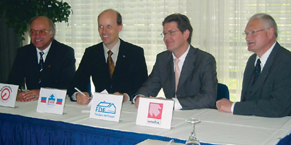 Vertragsunterzeichnung für Celo in Neuss (v.l.); Günther Muck (Baustoffring), Erk-Peter Radbruch (EGN), Heinz Slink (FDF) und Herbert Schwanz (Nowebau).