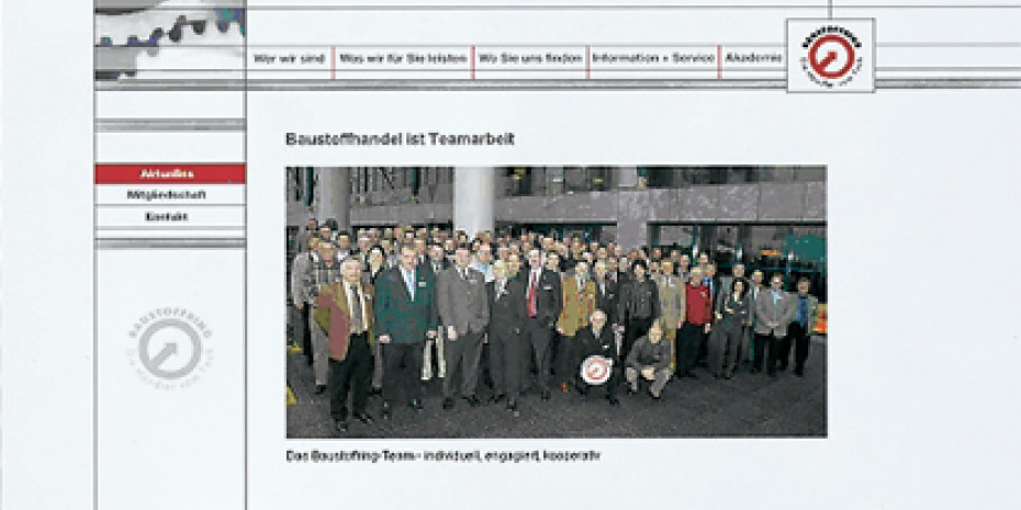 Im Frühjahr 2003 hatte der Baustoffring die Aktualisierung seines Internet-Auftritts abgeschlossen. Jetzt sollen die aktuellen Internet-Seiten übersichtlich und genau über die Strukturen und Leistungen der Kooperation informieren. Sie erläutern die dezentrale Arbeitsweise des Baustoffrings und liefern eine Übersicht über die kooperativen Leistungen in Einkauf, EDV-Technik, Beschaffung und Weiterbildung. Zum Leseangebot gehören außerdem die Geschäftsphilosophie, Portraits der Vorstandsmitglieder und eine interaktive Karte, die zu allen Baustoffring-Partnern führt und mit deren Internet-Auftritten verknüpft ist.