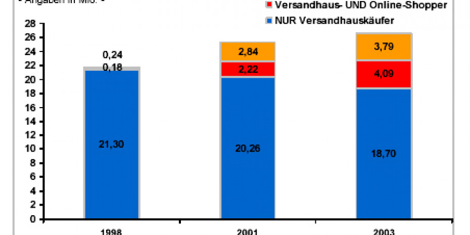 Dabei ist zwar die Zahl derjenigen, die ausschließlich im Versandhandel kaufen, um 2,60 Mio. zurückgegangen, gleichzeitig hat die Zahl der Personen, die sowohl per Katalog bzw. Anzeigencoupon im Versandhandel als auch Online einkaufen, um 3,91 Mio. zugelegt. Das Online-Shopping beschert dem traditionellen Versandhandel einen Zuwachs von 1,31 Mio. Personen. Rasant ist die Zahl der Online-Shopper von 420.000 Personen im Jahr 1998 auf heute fast 8 Mio. gestiegen. Dies bedeutet, dass 45 Prozent aller Personen ab 18 Jahren, die in den letzten zwölf Monaten im Internet waren, auch online eingekauft haben.