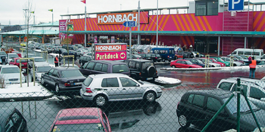 Der Hornbach-Markt von außen mit den Lastenaufzügen zum Parkdeck.