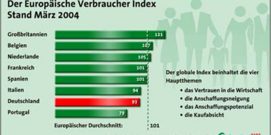 In Europa ist die Stimmung der Verbraucher gesunken. Besonders davon betroffen sind Frankreich, Deutschland, Italien und die Niederlande. In Deutschland hat der Europäische Verbraucherindex einen neuen Tiefstand erreicht. Lag er im Mai 2003 bei 96 und im November 2003 bei 95 Indexpunkten, sind es jetzt lediglich noch 93. Deutschland bleibt somit auf dem vorletzten Platz vor Portugal.