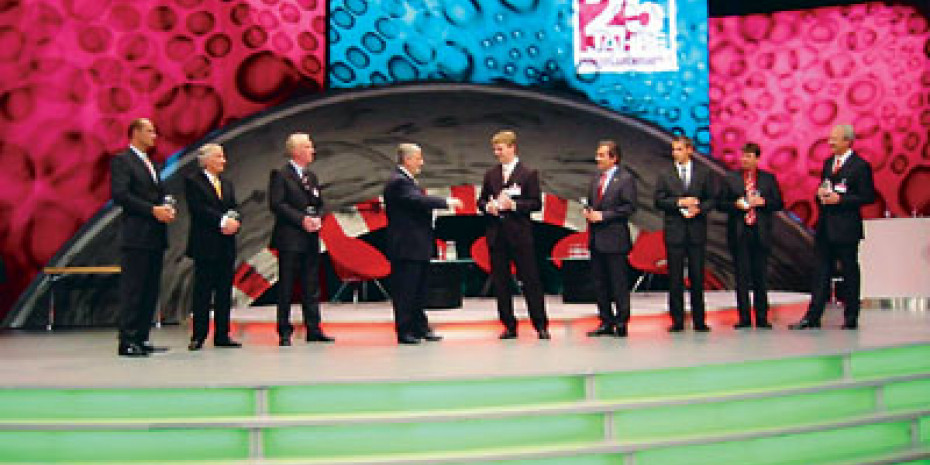 „Gemeinsam richtig durchstarten“, unter diesem Motto standen die ganzen Feierlichkeiten, vom Ketcar zum Formel 1-Boliden sozusagen. Die Bühne erinnerte teils an eine Rennpiste, teils an ein Fahrerlager, in dem die unterschiedlichsten Gäste von der Moderatorin diverser Heimwerkersendungen auf Pro 7 interviewt wurden. So kamen die beiden ehemaligen Einzelhandelsgeschäftsführer der Hagebau Gustav Vehmeier und Klaus Safier zu Wort, dazu natürlich auch der Hagebau-Aufsichtsratsvorsitzende Rolf J. Wertheimer sowie der Zeus-Geschäftsführer Dr. Peter Breidenbach. Dazu aber auch zahlreiche Abteilungsleiter, Gesellschafter und Marktleiter, die alle über die Geschichte, den aktuellen Zustand und die Zukunft „ihrer“ Hagebaumärkte Auskunft gaben.