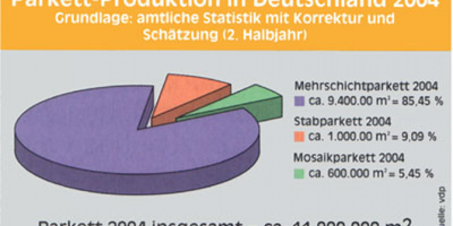 Für Stabparkett rechnet der Verband mit einem Verbrauch von 2,7 Mio. m². Das entspricht einem Rückgang von 0,4 Mio. m² gegenüber 2003. Auch bei Mosaikparkett liegt die produzierte Menge nach den Zahlen des Verbandes der deutschen Parkettindustrie mit 1,7 Mio. m² niedriger als im Vorjahr, als noch 2,5 Mio. m² hergestellt wurden.