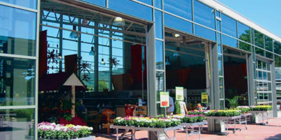 Die Warmhalle des Gartencenters lässt sich zur Freifläche hin öffnen.