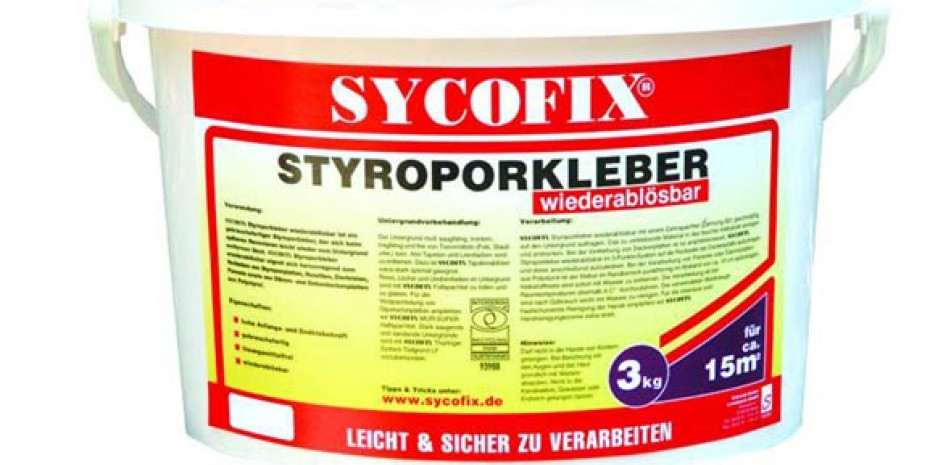 Wie der Name schon sagt, ist der „Sycofix Styroporkleber wiederablösbar“ leicht wieder vom Untergrund zu entfernen, was beim späteren Renovieren von Vorteil ist, so der Anbieter. Der gebrauchsfertige Styroporkleber wiederablösbar eignet sich, so das Unternehmen weiter, hervorragend zum Verkleben von Styroporplatten, Rosetten, Zierleisten, Paneelen sowie Dämm- und Deckordeckenplatten aus Polystyrol. Auch die hohe Anfangs- und Endklebekraft zeichne das Produkt der Edmund Sieder Leimfabrik GmbH aus. Mit dem 5-Punkte-System ist das Produkt leicht und sicher auf saubere Untergründe aufzukleben. Der 3-kg-Behälter reiche für 15 m² aus.