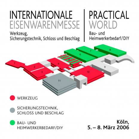 Im Zuge des Neubaus werden sämtliche Hallen neu durchnummeriert (siehe auch Tabelle am Schluss). Neu gestaltet wird auch die Hallenbelegung: Kompakt strukturiert orientiert sie sich an den neuen Gegebenheiten sowie an einer sinnvollen Nachbarschaft der Aussteller entsprechend der Absatzwege und Sortimente im Handel. In allen drei Angebotsschwerpunkten werden dabei bewährte Strukturen und neue Ansätze optimal kombiniert. Die Internationale Eisenwarenmesse belegt mit den beiden Säulen Werkzeug (Hallen 1 bis 4 und 10…