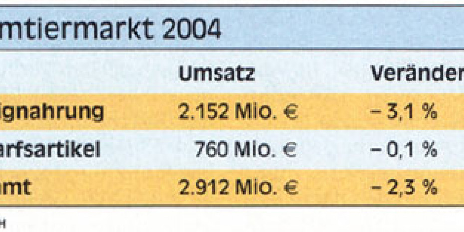 Das Volumen des Heimtiermarkts ist im Jahr 2004 um 2,3 Prozent auf 2,912 Mrd. € zurückgegangen. Dies ist das Ergebnis der neuen Struktur- und Umsatzdaten des Industrieverbandes Heimtierbedarf (IVH). Dabei fielen die Umsatzverluste bei Hunde- und Katzennahrung mit 3,6 und 3,1 Prozent besonders ins Gewicht. Mit einem Umsatzrückgang von 0,1 Prozent blieb der Zubehörbereich einigermaßen stabil. Dagegen ist die Heimtierpopulation im vergangenen Jahr deutlich gestiegen.