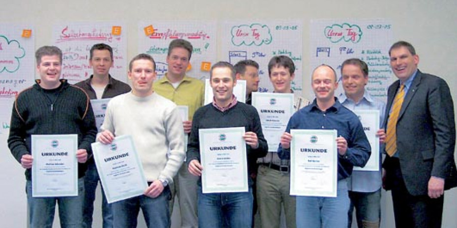 Erstmals hat die Hagebau, Soltau, jetzt einen Lehrgang zum Kundenmanager abgeschlossen. Mit den erfolgreichen Teilnehmern freut sich Schulungsleiter Marc Oliver Windbacher (r.).