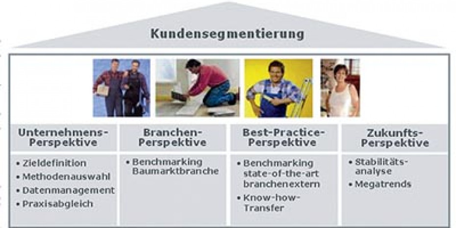Unternehmensperspektive: Nach einem kurzen Strategie-Check, der eine inhaltliche Fokussierung sicherstellt, werden die Kundendaten, z.B. aus Kundenkartensystemen, systematisch aufbereitet. Dazu wird das Datenmanagement analysiert und für die Segmentierung vorbereitet. Im Anschluss wird die für die jeweilige Ausgangssituation optimale Segmentierungsmethode gewählt. Gleichzeitig wird mit Hilfe einer erprobten Moderationsmethode ein Praxisabgleich durchgeführt.