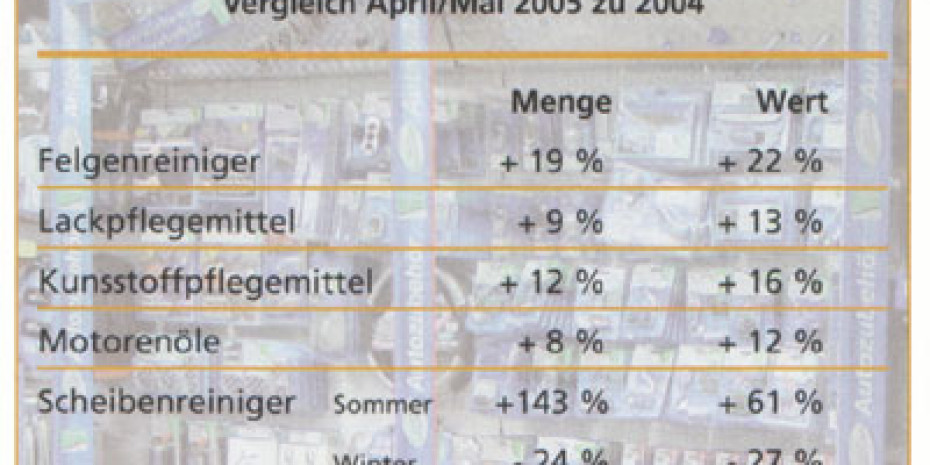 Am auffälligsten nach oben bricht das Segment Scheibenreiniger aus. Hier hat es der Baumarkt offensichtlich geschafft, Marktanteile an sich zu ziehen. Um sage und schreibe 143 Prozent ist dieses Segment in den Monaten April und Mai 2005 im Vergleich zum Vorjahreszeitraum nach oben geschossen. Dass hier insbesondere preisaggressive Angebote die Kunden vermehrt in die Baumärkte gelockt hat, zeigt ein Blick auf den erzielten Wert. Dieser liegt mit einem Plus von 61 Prozent deutlich unter der Zunahme bei der Menge. Das Sparen beim Autoservice führt eben inzwischen auch dazu, dass die Scheibenwischbehälter aufgefüllt werden, bevor das Fahrzeug zum Service in die Werkstatt gestellt wird.