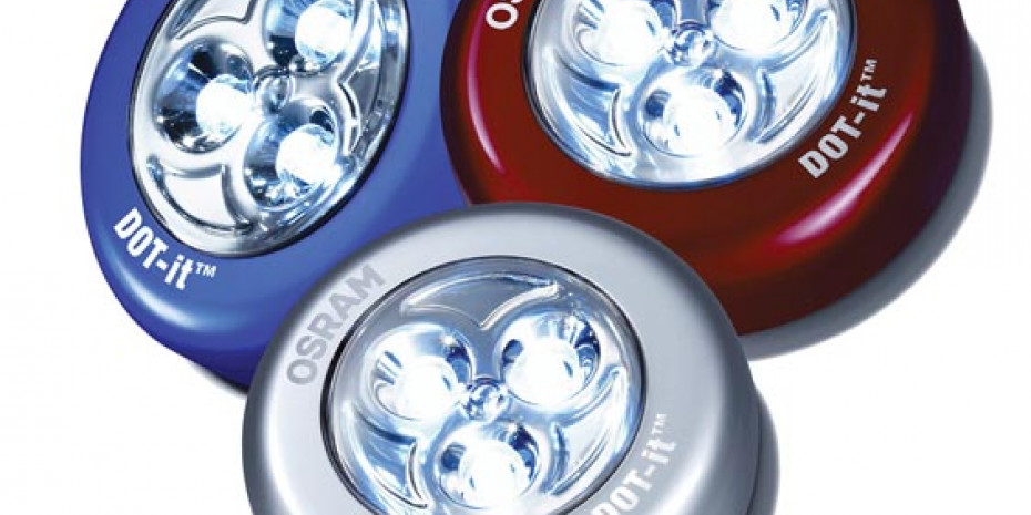 Oftmals gibt es Stellen, an denen dringend Licht benötigt wird. Mit „Dot-it“ will Osram hierfür eine einfache Lösung bieten. Denn Dot-it sei das geniale Überall-Licht, so der Anbieter. Es hafte dank eines Klebestreifens auf der Rückseite praktisch auf allen Oberflächen. Ausgestattet ist das Produkt mit drei leistungsstarken, weißen LEDs. Verfügbar ist es in Silber, Schwarz, Rot, Orange, Pink, Lemon, Blau, Chrome und Gold. Osram gibt die Batterielebensdauer mit 100 Stunden an. Das Produkt wird inklusive drei auswechselbaren Mikro Batterien angeboten.