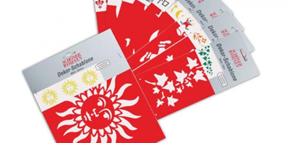 Mit der großen Motivauswahl der Schöner Wohnen Dekor-Schablonen werden im Handumdrehen, so der Anbieter, die schönsten Verzierungen auf Wände, Möbel und Accessoires gezaubert. Die Kollektion reicht von floralen Motiven über diverse Ornamente bis hin zu den typischen Kinderzimmermotiven wie z.B. Delfine oder Sonne, Mond und Sterne. Passend dazu gibt es einen Schablonierpinsel und einen entsprechenden Schablonenhalter, der für jeden Regaltyp geeignet ist.