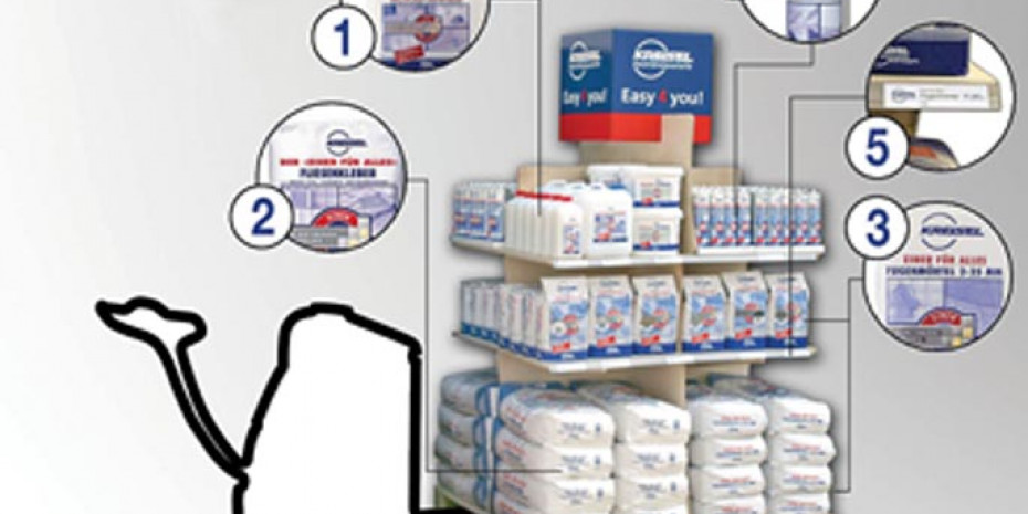 Kreisel bietet eine neue Fliesentechnik unter dem Titel „Einer für Alles“. Für Handel und Kunden, so der Anbieter, bedeute das „Einer für Alles“ Fliesensystem eine enorme Einsparung an Kosten und Zeit. Denn: In nur einem Regal – als Wandregal oder freistehend (Easy 4 You) kann ein Fliesenverlege-System für alle Anwendungen am PoS präsentiert werden. Mit Grundierung (siehe Bild 1), Fliesenkleber (2), Fugenmörtel (3) und Silicon (4) bestückt und ausgezeichnet (5) wird das Easy 4 You-Regal im Markt platziert. Der Bedarf an wertvoller Regalfläche werde ebenso reduziert wie die kostenintensive Beratung im Markt. Und der Kunde erhalte immer das richtige Produkt.