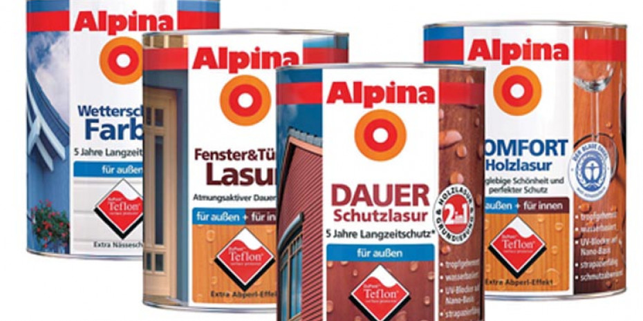 Die neuen Alpina Holzschutz-Lasuren wollen einen neuartigen und länger anhaltenden Schutz von Holzoberflächen bieten. Als erster Hersteller, betont Alpina, bringe man den Teflon „surface protector“ bei seinen Holzschutz-Produkten zum Einsatz. Die innovative Rezeptur bewirke einen speziellen Abperl-Effekt und damit eine schnellere Trocknung. So bleiben Hölzer im Außenbereich dauerhaft vor Nässe, Pilzbefall und Fäulnis geschützt, stellt der Anbieter heraus. Die Lasuren enthielten einen extrastarken UV-Blocker auf Nanopartikel-Basis. Anders als herkömmliche Pigmente schützen die Nano-Partikel vor Sonneneinstrahlung, ohne die Farbbrillanz zu verschleiern. Das bedeute höchste Transparenz und Farbqualität über Jahre hinweg.