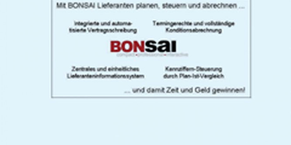Wer wünscht sich nicht, alle Informationen zu seinen Lieferanten auf Knopfdruck verfügbar zu haben? Ob Konditionen oder Ansprechpartner, Kennziffern zur Beurteilung und Steuerung oder Verhandlungsunterlagen zum Jahresgespräch, das alles kommt jetzt aus einem System, dem integrierten Vertrags- und Konditionen-Management „Bonsai“ der IBB Informationsverarbeitung GmbH in München. Um den seit Jahren bewährten Kern, die automatisierte Abrechnung von nachträglichen Vergütungen, hat die IBB neue Bausteine integriert, die es jetzt auch ermöglichen, Lieferantenstammdaten, Verträge, Liefer- und Servicebedingungen und Kennziffern zu verwalten. Erstmals werde auch die detaillierte Planung von Einkaufsumsätzen und Konditionserträgen und ihr kontinuierlicher Abgleich mit den Ist-Daten unterstützt, so IBB.