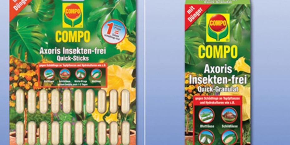 Die neuen Compo-Axoris Insekten-frei Quick-Sticks und das neue Compo Axoris Insekten-frei Quick-Granulat wirken, versichert der Hersteller, schneller und länger als vergleichbare Produkte. Sie werden für die Bekämpfung von Blattläusen, Thripsen, Zikaden, Schildläusen, Weißen Fliegen und Wollläusen an Zimmer-, Balkon-, Terrassen- und Gewächshauspflanzen eingesetzt. Bereits ein bis zwei Tage nach der Anwendung sind den Angaben zufolge in der Regel 70 Prozent aller Blattläuse abgetötet. Die Wirkungsdauer hält über einen Zeitraum von bis zu 16 Wochen und länger an. Verantwortlich dafür ist der neue Wirkstoff Thiamethoxam. Gleichzeitig sorgt Dünger für eine Kräftigung der Pflanzen.