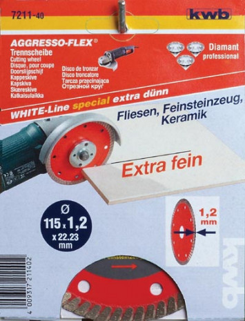 Die neuen „Agresso-Flex“ Diamant-Dünntrennscheiben vom Zubehörspezialisten kwb wollen dem Verbraucher diverse Vorteile bieten: saubere Schnittkanten, schnelles und präzises Trennen sowie hohe Standzeiten und damit ein hervorragendes Preis-Leistungsverhältnis. kwb bietet die „Erfolgsscheiben“ im Durchmesser 115 mm und 125 mm. Besonders geeignet sind die nur 1,2 mm dünnen Diamant-Trennscheiben für Fliesen, Feinsteinzeug und Keramik.