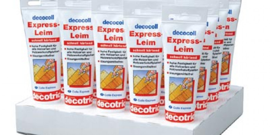 Das Produkt „decocoll“ von Decotric ist ein schnell härtender, lösungsmittelfreier Weißleim für alle Holzarten und Holzwerkstoffplatten. Ideal sei er, so der Anbieter, für Montageverleimungen, für Dübel- und Zapfenverbindungen, Furnier- und Plattenverleimung, für Holzumleimer, Furnierkanten sowie Bastelarbeiten. Der Leim trockne transparent auf, die Fuge bleibe elastisch und sei alterungsbeständig. Lieferformen: 500 g Flasche, 250 g Standtube mit Verschlussdorn und 60 g Tube – für kleine, schnelle Reparaturen.