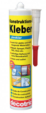 Der „decotric Konstruktionskleber ist ein neuer, kristallklarer MS Polymer Klebstoff für nahezu unsichtbare Verklebungen. Er sei, so der Anbieter, extra stark und hoch belastbar und eigne sich für saugfähige und nicht saugende Materialien und Untergründe – wie glasierte Fliesen, Metall, Spiegel, Glas, Keramik, PVC, Polystyrol, Holz, Kork, Stein, Putz, lackierte Flächen und viele Kunststoffe. Weitere Produkteigenschaften: Lösungsmittelfrei, witterungs- und UV-beständig, dauerelastisch, überstreichbar mit Acryllacken und Dispersionsfarben und nach Aushärtung temperaturbeständig von –40 bis +90 °C.