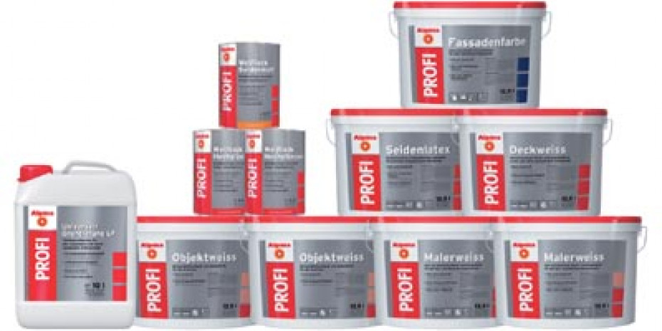 Mit dem Sortiment „Profi“ öffnet sich Alpina neuen Zielgruppen im Baumarkt. Anspruch und Umfang der Produkte liegen zwischen den Sortimenten für den Fachgroßhandels-Kunden und denen für den Heimwerker: Alpina Profi-Produkte, so der Anbieter, ermöglichen professionelle Ergebnisse und zugleich eine einfache und sichere Anwendung bei geringem Zeitaufwand. Zum neuen Sortiment gehören Innendispersionsfarben für vielfältige Anwendungsbereiche, Fassadenfarben und Lacke sowie passende Grundierungen und weitere Spezialprodukte. Optisch wird der neue Anspruch durch das sachliche Design der Gebinde deutlich, das sich mit silbergrauen Etiketten und roten Deckeln deutlich vom übrigen Alpina-Sortiment für den DIY-Kunden unterscheidet.