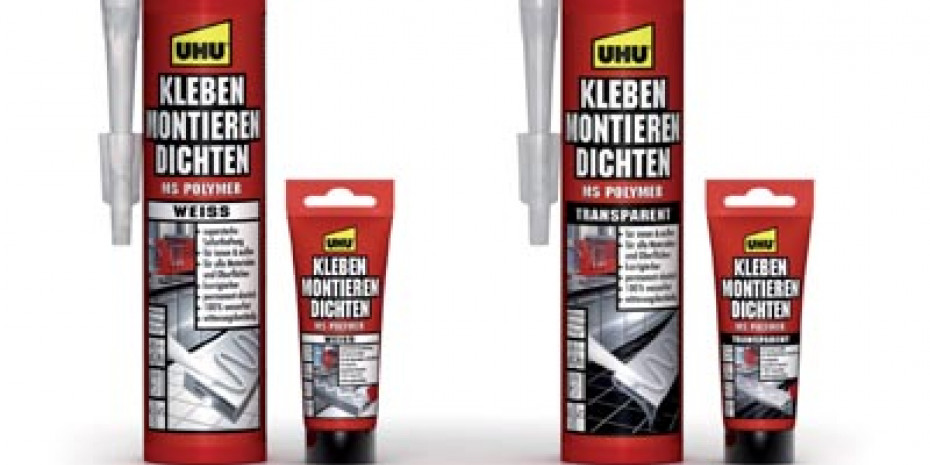 Mit Uhu „Kleben Montieren Dichten“ bietet das Unternehmen einen professionellen Montage-Dicht-Klebstoff auf MS-Polymer-Basis in Weiß und Transparent an. Die elastische Formel, so der Anbieter, biete hervorragende Klebekraft auf vielen Materialien und Oberflächen bei gleichzeitig silikonähnlicher Flexibilität und Dichteigenschaft. Das Produkt sei, obwohl lösemittelfrei, witterungsbeständig und zu 100 Prozent wasserfest und damit auch gut für den Außeneinsatz geeignet. Es bleibe dauerhaft elastisch und sei überstreichbar.