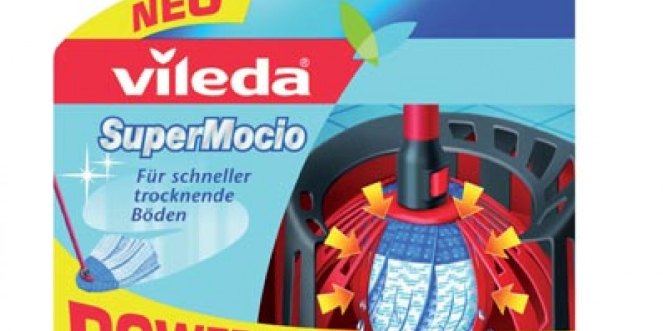 Spürbar einfacher und schneller, so Vileda, sei der „Wischmop Super-Mocio“. Die Tuchstreifen des „Vileda Super-Mocio“ bestehen, so der Anbieter, aus Vliesstoff sowie „Collec-Tex“-Aktivfaser und reinigungsstarker Microfaser mit Pick-up Poren. Diese einzigartige Technologie überzeuge durch bis zu 40 Prozent bessere Schmutzaufnahme. Inspiriert von der Natur sei der „Power Press“ Eimer-Auswringer entstanden, der ein leichteres Auswringen des Wischmops ermögliche: Bis zu 30 Prozent bessere Auswringleistung habe das Produkt und ermögliche damit schneller trocknende Böden.