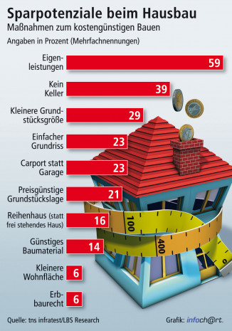 Die Nummer zwei der Rangliste - der von 39 Prozent genannte Verzicht auf den Keller - zeigt die vielfältigen Möglichkeiten einer weitsichtigen Spar-Planung. Auch die Garage ist kein Muss für der Deutschen liebstes Kind, das Auto. Knapp ein Viertel der Bauherren gibt aus Kostengründen der billigeren Variante, dem Carport, den Vorzug. Dass häufig Kompromisse zwischen Preis und Qualität schwierig sind, zeigt sich bei der Wahl des Grundstücks: Während sich laut Umfrage aus Kostenspargründen nahezu 30 Prozent für ein kleineres Grundstück entscheiden, sind sie bei der Lage weniger konzessionsbereit. So kommt eine Gemeinde mit niedrigeren Grundstückspreisen relativ selten in Betracht (neun Prozent). Und es sind auch nicht so viele Interessenten, die innerhalb der Stadt aufs günstigere Grundstück setzen (21 Prozent).