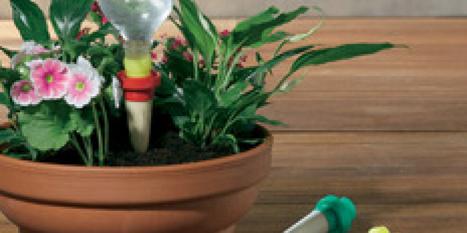 Als genial einfaches automatisches Bewässerungssystem für Zimmer-, Balkon- und Terrassenpflanzen sowie Gemüsekulturen beschreibt der Anbieter Aquasolo sein Sortiment. Mit dem Aquasolo-System können Pflanzen bei Zeitmangel und Abwesenheit mit einer handelsüblichen Getränkeplastikflasche als Wasserspeicher bis zu 70 Tage automatisch bewässert werden. Dazu wird der mikroporöse Keramikkegel auf eine Plastikflasche geschraubt und in die Erde gesteckt. Das weltweit patentierte System mit drei verschiedenen Gewinden erlaubt es, nahezu jede 0,5- bis 5-Liter-Plastikflasche zu verwenden. Für die bedarfsgerechte Bewässerung gibt es vier farblich differenzierte Ausführungen mit Wassergaben von sieben, 20, 30 oder 50 cl Wasser innerhalb von 24 Stunden.