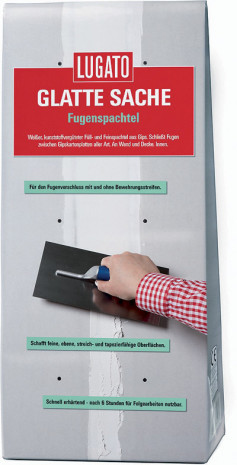 Lugato glatte Sache Fugenspachtel ist ein weißer kunststoffvergüteter Füll- und Feinspachtel aus Gips zum Füllen von Fugen zwischen Gipskartonplatten. Er schafft als Feinspachtel glatte, ebene, streich- und tapezierfähige Oberflächen und ist geeignet zum Ansetzen von Gipskartonplatten und für den Verschluss von Schlitzen, Dübel- und Schraubenlöchern. Das Produkt ist bereits nach sechs Stunden überstreich- und tapezierbar. Er erfüllt die Anforderungen als Fugenspachtel Typ 4B nach EN 13963 und ist für Anwendungen im Innenbereich an Wand und Decke geeignet. www.lugato.de