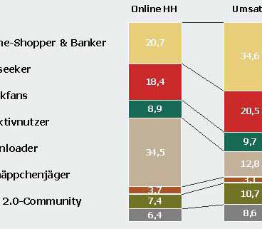 Allerdings zeigt sich, dass einzelne Konsumentengruppen das Internet als Einkaufsmöglichkeit völlig unterschiedlich nutzen. Hierfür hat die GfK Panel Services Deutschland die Konsumenten in sieben verschiedene Online-Nutzer-Typen segmentiert. Die meisten Verbraucher - insgesamt knapp 35 Prozent - gehören zur Gruppe der Selektivnutzer. Diese Gruppe erwirtschaftet aber nur knapp 13 Prozent des Umsatzes. Den größten Anteil am Umsatz liefert die Gruppe der Online-Shopper und Banker, die mit gut 20 Prozent die zweitgrößte Gruppe der Internetnutzer stellen. Sie erwirtschafteten knapp 35 Prozent des E-Commerce-Umsatzes.