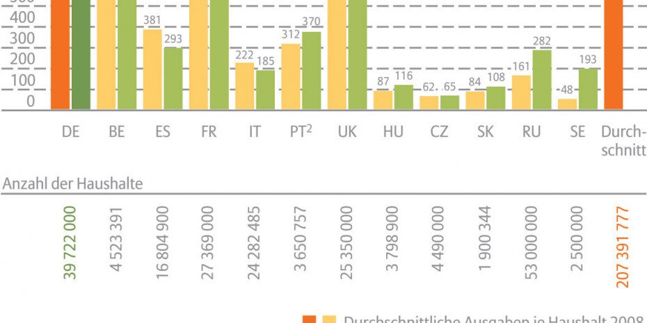 Die europäische Baumarktbranche kann für 2008 einen geringen Zuwachs verbuchen, während sie in Deutschland einen leichten Rückgang hinnehmen muss. Trotzdem liegt der Umsatz hierzulande im Vergleich zu den Nachbarn weit vorne. Er wird in der Studie mit rund 38 Mrd. € beziffert. Die beiden anderen großen europäischen Märkte, Großbritannien und Frankreich, zeigen deutliche größere Abnahmen und erhöhen so den bereits ausgebauten deutschen Vorsprung weiter. Zusammengenommen teilen sich diese drei Nationen drei Vier-tel des europäischen Marktvolumens. Mit zweistelligen Wachstumsraten holen die zentral- und osteuropäischen Märkte aber weiter auf.