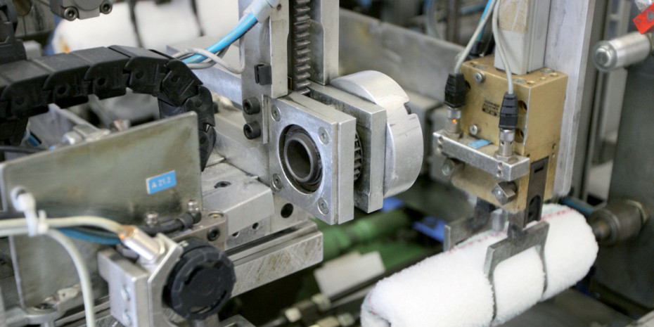 Wir stehen hier jetzt vor einer Maschine, wo Farbroller hergestellt werden. Die Rohre werden erhitzt und der Stoff per Thermofusion auf die Kunststoffrohre, die ja auch hier in Wieseth hergestellt werden, aufgezogen. Wie hoch ist die Fertigungstiefe von Friess Nespoli? Gute Frage. Die hohe Fertigungstiefe ist Basis für unsere Leistungsfähigkeit, Reaktionsgeschwindigkeit und, last but not least, für unsere Innovationen. In Wieseth verfügen wir über folgende Produktionsabteilungen: Spritzgussabteilung mit Extruder- Maschinen, Thermofusion und Montage für Profi- und DIY-Groß- und Heizkörperwalzen, Montage für Fassadenwalzen, Schaumwalzen-Fertigungstraße, Bügelfertigung, Fertigungstraße für Heimwerker- und Wannensets und eine Pinselfabrikation, insbesondere für hochwertige Flach- und Heizkörperpinsel. Der Anteil für in der Nespoli-Gruppe gefertigte Produkte für unsere Kernkompetenz Pinsel und Farbroller liegt bei über 95 Prozent, der Anteil aus deutscher Nespoli-Fertigung liegt dabei knapp über der Hälfte.