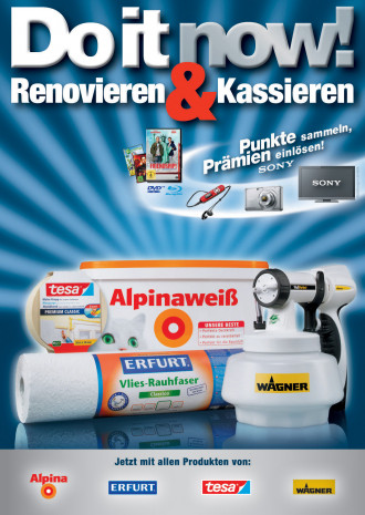 Starke Aufmerksamkeit, neue Kunden in den Märkten und zusätzliche Umsätze, dafür steht die Loyality-Aktion „Do it now! Renovieren & Kassieren“, die von Alpina Farben, Erfurt, Tesa und Wagner gemeinsam getragen wird. Das erfolgreiche Konzept des Bonus-Sammelsystems wird damit erstmals auf den Bau- und Fachmarktbereich übertragen. Das Besondere: Der Abverkauf von bereits vorhandener Ware wird beschleunigt, denn jedes Sortimentsprodukt der vier Partner ist gleichzeitig auch Aktionsprodukt. www.alpina-farben.de