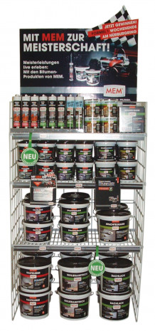 Mem bot eine Bitumen-Zusatzplatzierung mit einem attraktiven Formel 1 Gewinnspiel. Erster Preis der Gewinnaktion war ein Formel 1-Rennwochenende am Nürburgring für zwei Personen inklusive Übernachtung. Das Display präsentiert auf kleiner Fläche Schnelldreher zum Kleben und Dichten aus dem lösemittelfreien Bitumensortiment (Isolieranstrich, Profi Spachtelmasse etc). Das Display ist attraktiv gestaltet mit aufeinander abgestimmtem Topschild, Gewinnspielkarten im Dispenser und einer Informationsbroschüre für den Endverbraucher.www.mem.de