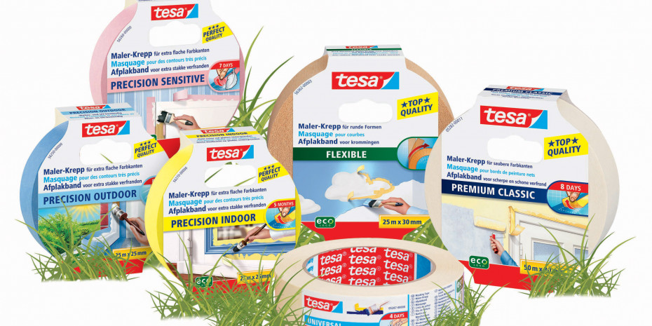 Tesa bietet ein nachhaltiges Maler-Krepp-Sortiment. Es ist lösungsmittelfrei und aus nachwachsenden Rohstoffen. Zudem ist es extrem dünn und reißfest. Weiter verfügt Tesa-Maler-Krepp-Precision über eine hervorragend abgestimmte Klebkraft für fast jede Anwendung. www.tesa.de