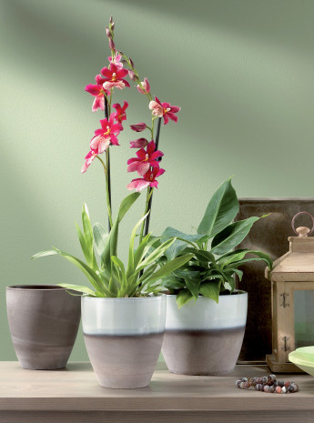 Mit White Earth setzt Scheurich attraktive Akzente. Der matte, erdig wirkende Übertopf ist im oberen Bereich mit einer glänzenden Schicht überzogen, die den Ton durchschimmern lässt. Der weiße Teil geht lebendig über einen dunkelbraunen Streifen in den unteren über. Die absolut wasserdichte Serie bietet Scheurich außer in White Earth in weiteren Farbvarianten an. Blüh- und Grünpflanzen finden in White Earth einen adäquaten Partner. Für rot oder weiß blühende Orchideen (Cambria, Phalaenopsis) steht neben den Übertöpfen ein hohes Pflanzgefäß zur Verfügung. www.scheurich.de